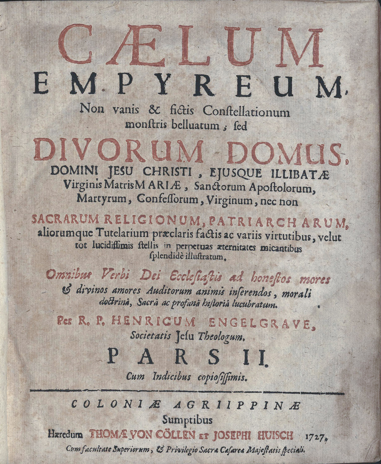 Caelum empyreum : non vanis & fictis Constellationum monstris belluatum, sed Diuorum Domus, Domini Jesu Christi, ejusque illibatae Virginis Matris Mariae, Sanctorum Apostolorum, Martyrum, Confessorum, Virginum, nec non Sacrarum Religionum, Patriarcharum, aliorumque Tutelarium praeclaris factis ac variis virtutibus, velut tot lucidissimis stellis in perpetuas aeternitates micantibus splendidè ilustratum ; Omnibus Verbi Dei Ecclesiastis ad honestos mores & divinos amores Auditorum animis inserendos, morali doctrina, Sacrâ ac profanâ historia lucubratum