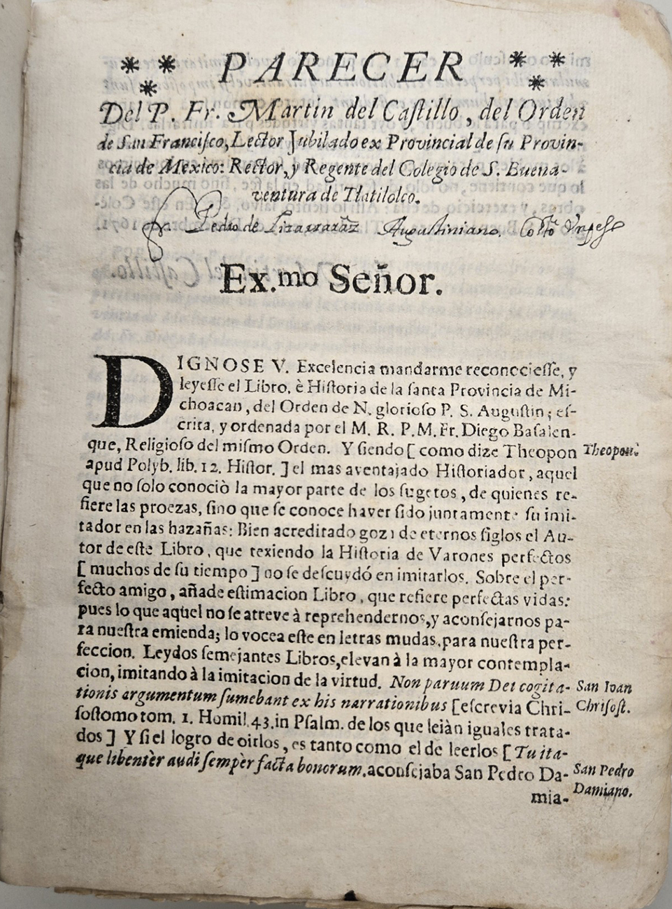 (1) La Lic. Ivette Arreola, de la Biblioteca Pública de San Nicolás de Hidalgo consultó un documento en el Archivo Histórico Casa Morelos (AHCMO), Fondo Diocesano / Sección Gobierno | Serie: Sacerdotes. | Subserie: Licencias | Año/1693/Caja 24/Expediente 71/Foja 1, en el cual el fraile Pedro de Lizarraraz, de la Orden de San Agustín de la Provincia de Michoacán, solicitó en 1693 licencia al Obispo de Guadalajara, Juan de Ortega, para poder predicar el santo evangelio y administrar el santo sacramento de la penitencia en el dicho obispado. Gracias a dicho documento, suponemos que el ejemplar perteneció al convento de Valladolid, en Morelia y no al de Guadalajara. El documento fue paleografiado por Dennis Pérez Bernabé.