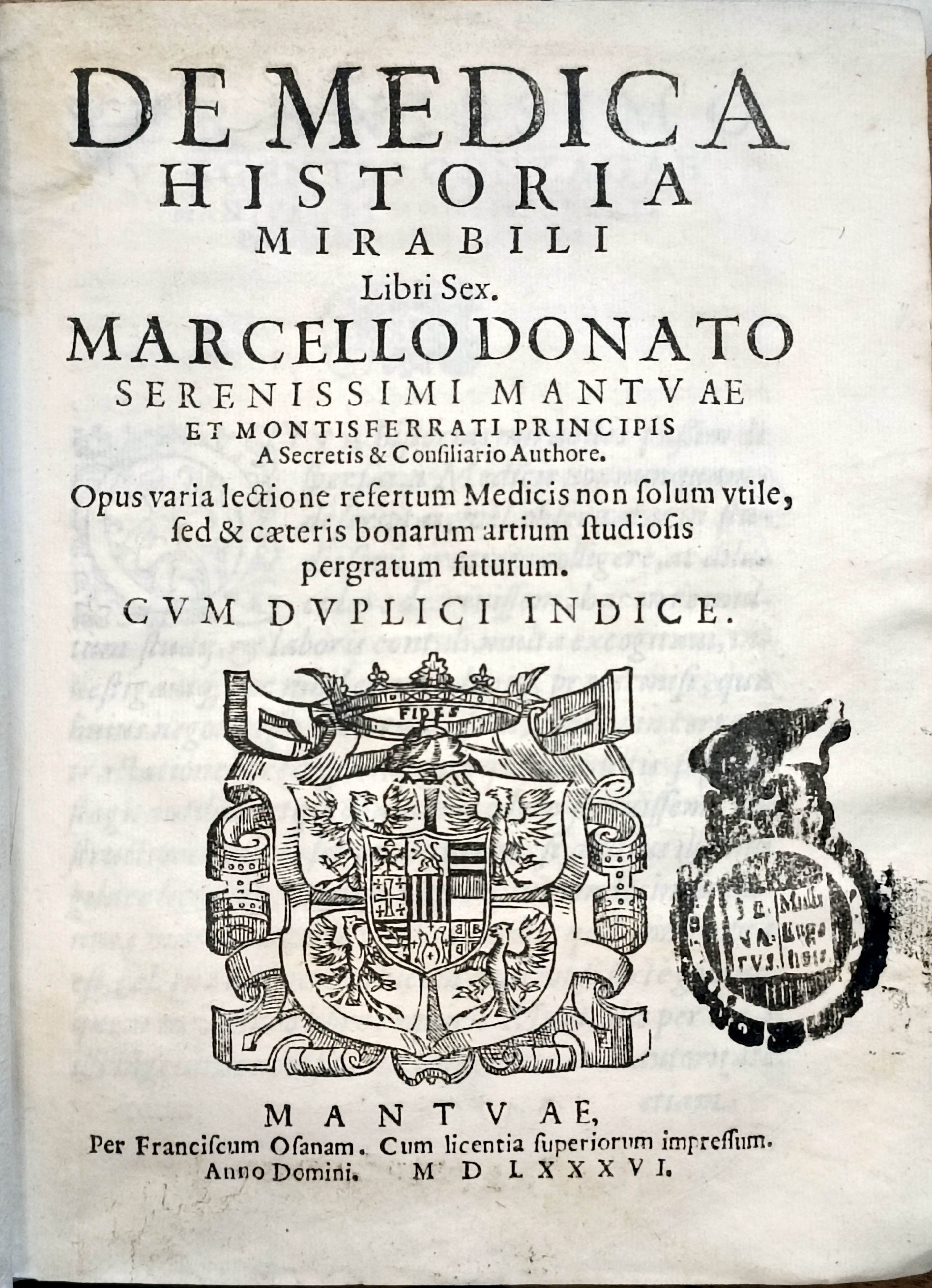 De medica historia mirabili libri sex. Marcello Donato serenissimi, Mantuae et Montisferrati principis a secretis & consiliario authore. ... Cum duplici indice